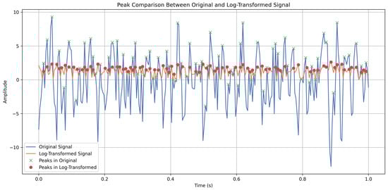 Figure 7 presents a comparison of the peak values between the raw signal and the logarithmically transformed signal for worn teeth. The raw signal exhibits significant amplitude fluctuations, with widely scattered peak distributions and irregular intervals between peaks, potentially reflecting the nonlinear characteristics of the wear process. In contrast, the logarithmically transformed signal demonstrates compressed amplitude ranges, smoother waveforms, and significantly reduced peak fluctuations. The logarithmic transformation highlights low-amplitude fluctuations and long-term trends within the signal, making subtle changes more prominent while smoothing out some of the sharper peak characteristics. By comparing the peak values of the two signals, it is evident that logarithmic transformation not only mitigates extreme fluctuations but also enhances the visibility of minor variations. This improvement facilitates the identification of low-amplitude changes in wear monitoring. In summary, logarithmic transformation plays a crucial role in signal processing by smoothing waveforms and emphasizing low-frequency components, thereby enabling more accurate monitoring of early changes in worn teeth.