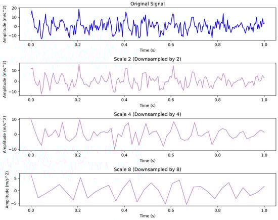 Next, the signal is down-sampled with factors of two, four, and eight to create multiple sequences at different time resolutions; the down-sampling factors of two, four, and eight were chosen because they follow a multiplicative relationship, allowing for a gradual reduction in temporal resolution to extract different signal characteristics sequentially. These factors are simple and efficient as they align with the binary nature of data processing. They are widely applied in fields such as signal processing and wavelet analysis, where their incremental pattern has been proven to effectively balance precision and efficiency. When changing the down-sampling factor reveals features in the high-, mid-, and low-frequency bands, larger factors yield lower time resolution and capture global trends, while smaller factors retain finer details for local analysis. The down-sampling process not only alters the time resolution of the signal but also reduces its amplitude to some extent. By applying down-sampling, local details of the signal are smoothed out, and the fluctuation amplitude gradually decreases. As a result, the signal exhibits a smoother variation trend at lower time resolutions. This process helps EMD to better identify low-frequency components of the signal and reduces the impact of noise on the decomposition results. The core of EMD lies in decomposing the signal into multiple intrinsic mode functions (IMFs), with each IMF representing a specific frequency component of the signal. Smaller amplitude fluctuations mitigate the interference of high-frequency noise during the EMD decomposition process. This ensures that the extracted IMFs better capture the essential characteristics of the signal rather than being overly influenced by transient peaks and local noise. The resulting signals after down-sampling by two, four, and eight are shown in Figure 8, illustrating how the tooth gap fault signature evolves across scales. These scaled signals enrich the information available for the subsequent EMD decomposition.