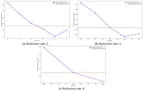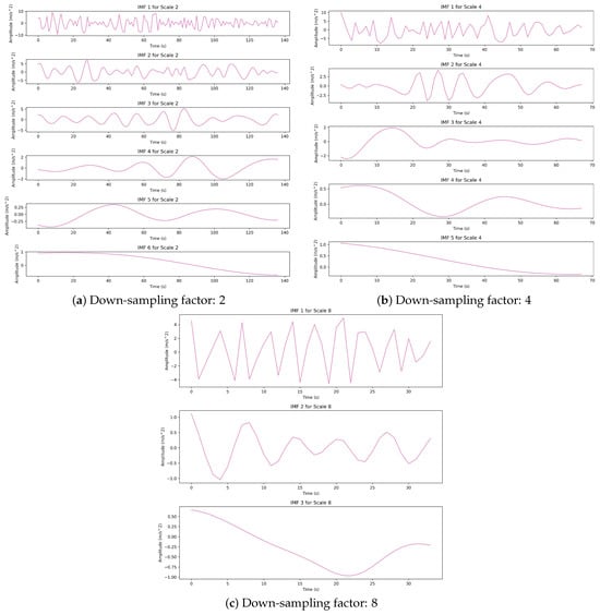 These multi-scale signals offer detailed input for the subsequent EMD process, enabling thorough analysis across various frequency ranges and temporal scales. This enables more precise extraction of key features of the tooth gap fault. After generating the multi-scale signals, we applied empirical mode decomposition to each scale separately. EMD works by iteratively peeling off the signal’s own oscillation patterns, so you do not need to define any wave shapes in advance. This flexibility makes it easier to uncover how the signal’s behavior changes over time. By performing EMD decomposition on signals at different scales, we can capture detailed information from various frequency bands. At higher time resolution, EMD extracts subtle changes and local vibration patterns, while at a lower time resolution, EMD is more effective at capturing the global trends and low-frequency components of the signal, offering a macro perspective on fault evolution. Figure 9 shows the EMD decomposition results of the tooth gap fault data at different down-sampling factors. The differences in frequency and time resolution of signals at various scales can be clearly observed, further validating the effectiveness of the MS-EMD method in multi-scale signal analysis.