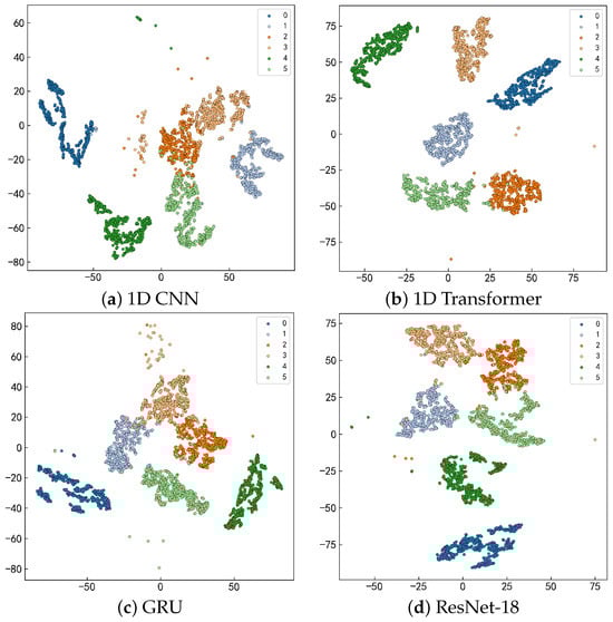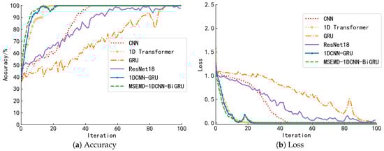 When MS-EMD is removed, the accuracy drops significantly by 0.71% and 1.00%, respectively, indicating the critical role of multi-scale feature decomposition in handling non-stationary signals and noise. Substituting single-scale EMD for MS-EMD results in a slight performance decrease (0.12% and 0.08%, respectively), reflecting the advantage of multi-scale decomposition in capturing complex signal features. Furthermore, replacing BiGRU with GRU causes a marginal accuracy decline (0.05% and 0.03%, respectively), verifying the importance of BiGRU’s bidirectional temporal modeling capability in dynamic feature recognition.