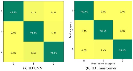 The one-dimensional convolutional neural network [] is an application of convolutional neural networks to one-dimensional data, making it an efficient deep learning model for processing time-series and vibration signals. As a flexible, adaptive feature extraction network, 1D CNN can automatically learn the local patterns and features in the data, eliminating the need for manual design and feature extraction, which greatly simplifies the feature extraction process. Compared with traditional feature extraction methods, 1D CNN is not only easier to operate but is also capable of extracting more effective features. Additionally, 1D CNN is more lightweight than 2D CNN, requiring fewer parameters and lower computational costs, which makes it especially important for processing large-scale signal datasets. It ensures high accuracy while significantly reducing the demand for computational resources.