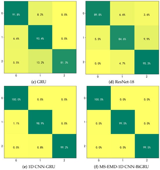 Secondly, the combination of MS-EMD with 1D CNN-BiGRU enhances the robustness against complex signals and effectively addresses noise interference and fault feature extraction issues. MS-EMD provides clearer and more accurate feature inputs to the 1D CNN-BiGRU through efficient decomposition and denoising, while 1D CNN-BiGRU leverages its deep learning structure to improve the model’s temporal modeling and fault classification capabilities.