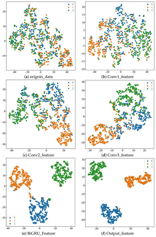 The proposed approach for diagnosing faults in industrial robot gearboxes utilizes MS-EMD and 1D CNN-BiGRU. The process begins with MS-EMD breaking down and reconstructing raw vibration data to refine signal quality. These signals are then analyzed by the 1D CNN-BiGRU model, which identifies key patterns and sequences. Methods like cross-validation and t-SNE visualization were applied to evaluate the model’s effectiveness and its ability to distinguish features. The integration of hardware and software ensured consistent performance and precision under varying conditions, supporting the accuracy and reliability of the findings.