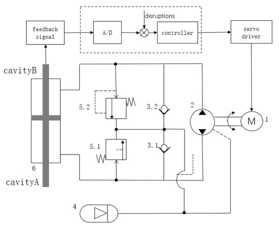 The electro-hydraulic servo pump control system is, on account of the servo motor, quantitative pumps, hydraulic cylinders, and functional valves, a highly integrated volume servo control unit, where the servo motor speed and torque can be adjusted, the system pressure and flow can be changed, and the hydraulic cylinder actuation output can be controlled. Compared with a traditional valve control system, this system eliminates the huge hydraulic station, complex pipelines, and expensive servo valves, effectively overcoming the poor anti-pollution ability, low integration, serious energy wastage, and other inherent technical shortcomings of electro-hydraulic servo valve control technology, offering high energy efficiency and energy savings, a high power-to-weight ratio, and environmental friendliness, among other technical advantages. The working principle diagram of the electro-hydraulic servo pump control system is shown in Figure 1.