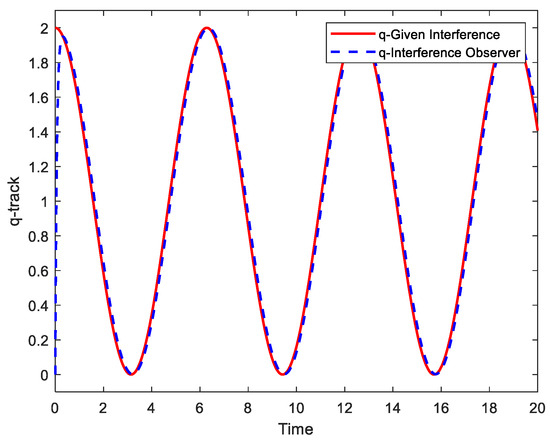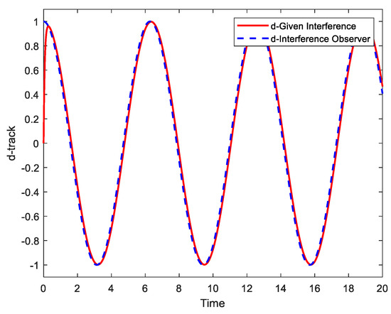 Experiment 1: The sinusoidal signal is selected as the control target, and perturbations and are and , respectively. The tracking performance of the above three controllers under the same conditions is shown in Figure 2, and the tracking error curves are shown in Figure 3. The observations of the perturbation observer are shown in Figure 4 and Figure 5.