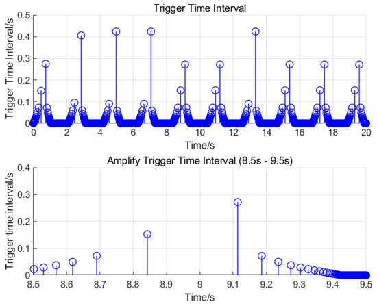 The triggering instant and triggering interval of the event trigger are shown in Figure 8. From the figure, it can be observed that the event trigger triggers the data transmission only when the system state reaches the preset triggering conditions, and this mechanism contrasts with the traditional time-triggering method. By analysing the distribution characteristics of the triggering time interval, it can be seen that the event trigger mechanism can effectively filter redundant data and reduce unnecessary information transmission. Specifically, when the system state changes slowly, the triggering interval increases significantly; meanwhile, in the phase of a rapid state change, the triggering frequency increases accordingly. This adaptive feature significantly improves the bandwidth utilisation of the network system. At the same time, due to the reduction in redundant data transmission, the real-time performance and reliability of the system are also improved accordingly, providing an efficient data transmission solution for resource-constrained network environments.