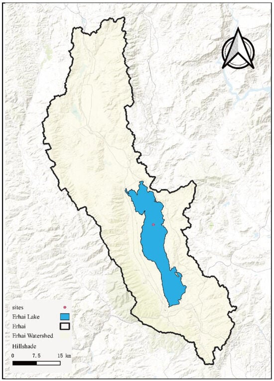 A map of the Erhai watershed. The blue area represents Erhai Lake, while the black boundary outlines the Erhai watershed. The pink dot indicates the monitoring site. The background hillshade provides topographic context.