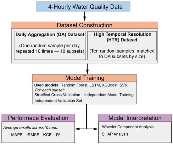 The experiments (see Figure 2) use 4-hourly water quality monitoring data from the Erhai watershed to create two distinct datasets: a low-frequency daily aggregation (DA) dataset and a high-frequency 4 h high temporal resolution (HTR) dataset. We generated the DA dataset through a specific method: for each calendar day, we randomly selected one observation from the raw dataset as the representative value. This sampling process was repeated ten times to create ten DA data subsets.
