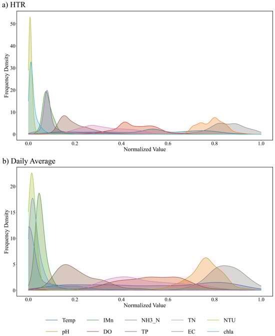The parameter distribution characteristics are shown in Figure 3. In the HTR data, the distribution of standardized values for water quality parameters shows a multimodal pattern: temperature (Temp) forms a steep unimodal peak near zero, IMn forms a broad peak around 0.50, extending into the 1.00 range, and NH3_N and TN show primary peaks at 0.00 and 0.20, respectively, with TN exhibiting a slight right skew in the range above 0.4 (Figure 3a). In comparison, the daily average parameters demonstrate a more concentrated distribution pattern: pH and chla form sharp peaks near the origin, with DO showing a prominent peak at 0.4 and a notable right skew, EC displays a broad peak around 0.3, and TP shows a rapid decay in the right tail (right plot). The differences in kurtosis among the parameter distributions indicate that the HTR data have a wider range of variability compared to the daily average data, with IMn and EC exhibiting the broadest distribution spans across both timescales.