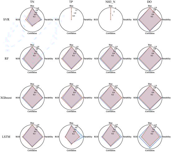 In this section, we discussed the temporal scaling effects using the Kling–Gupta efficiency metric and its components. The KGE measures the model performance by considering the bias, correlation, and variability between the prediction and observation. The results are shown in Figure 4. Among the prediction models, SVR exhibits the lowest KGE scores in predicting TN, TP, and NH3-N. The consistently poor performance (KGE = 0.42–0.56 for TN, approximately 0.00 for both TP and NH3-N) stems from inadequate correlation metrics and extreme bias amplification (bias ratios of 1.02–1.28 for TN, 1.28–1.87 for TP, and 1.58–3.00 for NH3-N), indicating fundamental limitations in capturing temporal patterns of target variables.