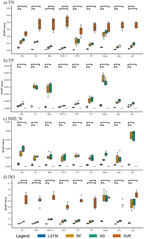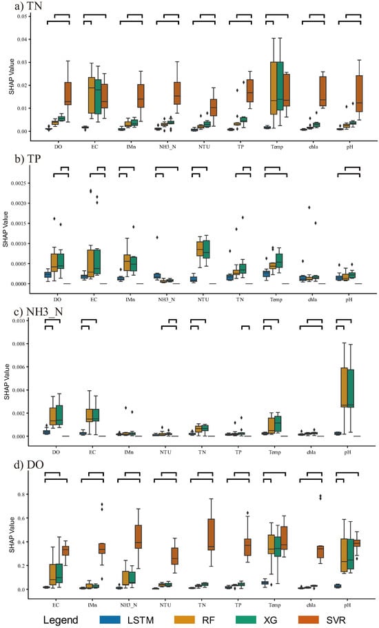 Statistical analysis revealed significant differences in SHAP values between models across all water quality parameters. For TN prediction, SHAP analysis revealed that DO and temperature were the primary influencing factors. The SVR model showed higher dependency on DO, EC, and temperature (SHAP values 0.04–0.05) compared to the RF and XGBoost models (SHAP values < 0.02). This pattern of feature importance might explain why RF and XGBoost achieved better HTR performance (KGE = 0.80–0.83) compared to daily aggregation (KGE = 0.70–0.75), as these models possibly better captured sub-daily variations (variability correlation 0.84–0.89 vs. 0.75–0.84 daily). The relationship between environmental factors and nitrogen dynamics has been well-documented in previous studies [36,37].