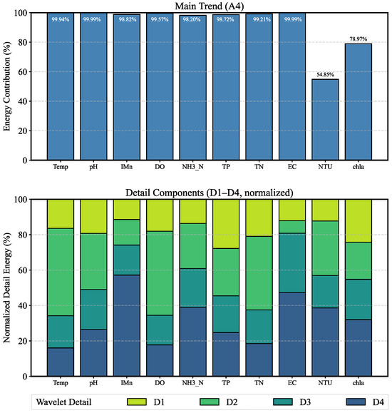 The previous analysis implied that the benefit of using high temporal data is not univocal. Both model structure and SNR of the data may play a role in the final performance. In this section, by analyzing wavelet decomposition, we further delve into the temporal characteristics of water quality measurements to explore the predictability of target water quality parameters. Under a 4 h sampling interval, the D1–D4 decomposition levels correspond to timescales of 8 h, 16 h, 32 h, and 64 h, respectively, thereby providing a comprehensive characterization of dynamic processes from intra-daily fluctuations to inter-weekly variations (Figure 7).