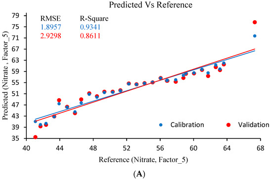 PLSR was utilized to evaluate the relationship between recorded spectral data and measured nitrate concentrations in yellow, red, and orange bell peppers. The model, developed using the entire dataset, yielded R2 values of 0.77, 0.85, and 0.81, respectively, for the three cultivars. As depicted in Figure 1, the PLSR model effectively captured the spectral data trends. In a separate study, Vis/NIR spectroscopy was employed to assess the impact of fruit temperature on malic acid content in sapodilla. PLSR, coupled with various spectral pre-processing techniques (Savitzky–Golay smoothing, normalization, Savitzky–Golay first and second derivatives, standard normal variate (SNV), and multiple scattering correction (MSC)), was applied to construct the calibration models. The findings validated the potential of Vis/NIR spectroscopy for determining malic acid content in sapodilla. Additionally, the results indicated that both storage temperature and fruit temperature significantly influenced the performance of PLSR models developed using Vis/NIR spectroscopy [31].