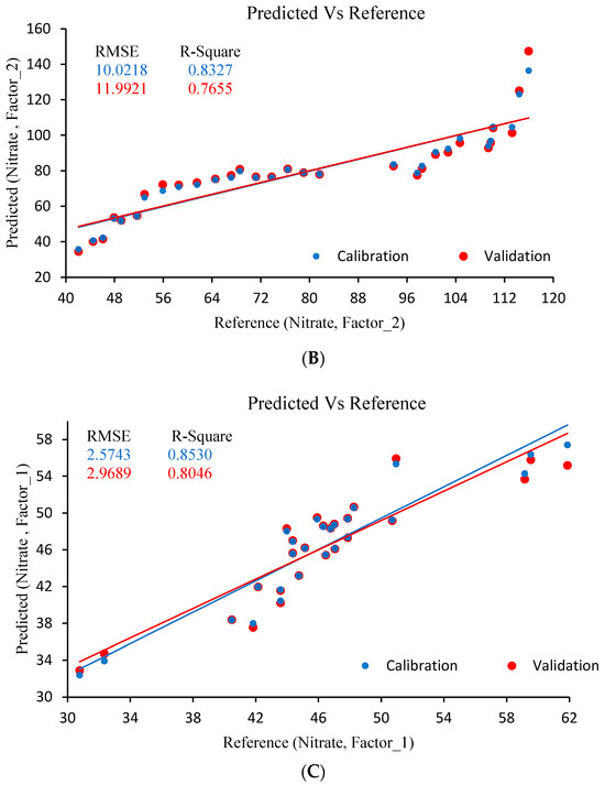 MLR, PLSR, and ANN models were employed to predict nitrate content using the effective wavelengths selected by the SVM-PSO algorithm. The performance of these models was evaluated based on R2 and RMSE values for both training and validation datasets (Table 3 and Table 4). Although the PLSR model generally outperformed the MLR model by exhibiting higher R2 values and lower RMSE across all three bell pepper cultivars, the ANN model demonstrated superior prediction accuracy and robustness, particularly during validation. The validation R2 values of the ANN model were 0.97, 0.99, and 0.92 for red, yellow, and orange cultivars, respectively, with corresponding RMSE values of 1.57, 3.17, and 4.37, confirming its outstanding performance. This superiority is attributed to the artificial neural network’s ability to capture the complex and nonlinear relationships inherent in spectral data, which traditional linear regression models like MLR and PLSR cannot fully represent. Therefore, the ANN model was selected as the preferred predictive approach due to its higher accuracy and greater adaptability to complex data patterns, making it a more reliable tool for accurately estimating nitrate content in bell peppers.