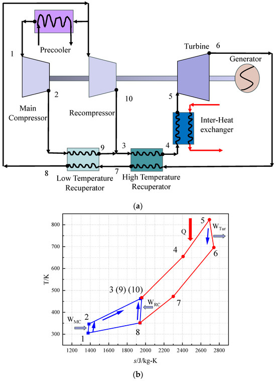 Schematic diagram and T-s diagram of the compression Brayton cycle. (a) Schematic diagram of the operation of the recompression cycle system; (b) T-s diagram of the recompression Brayton cycle.