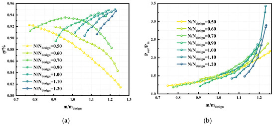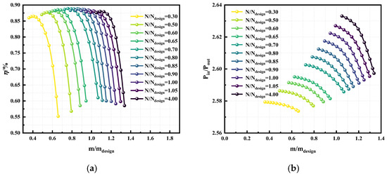 The characteristic curves of the compressor. (a) The pressure ratio curve of the compressor; (b) The efficiency curve of the compressor.
