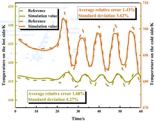 To verify the correctness and accuracy of the heat exchanger model, the same model parameters as in [27] were used for modeling. A sinusoidal response was applied to the hot side inlet temperature, and the outlet temperature’s dynamic response was compared with Deng’s calculation results [27]. As shown in Figure 4, the relative error of the outlet temperatures on both sides is within 5%. In addition, the mean absolute errors of the outlet temperatures at the cold and hot sides of the heat exchanger were calculated, with values of 0.8679 K and 0.5951 K, respectively. These results validate the accuracy of the heat exchanger model used in this study.