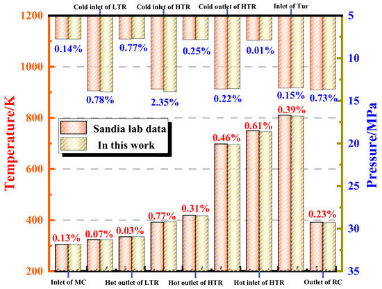 The same model data used by the Sandia Lab [28] were employed to verify the accuracy and validity of the established system. Key parameters at each critical point were calculated and compared with the results from the Sandia Lab [28]. As shown in Figure 5, the comparison between the results from this study and those from Sandia Lab indicates that the maximum error is less than 3%. In addition, the mean absolute errors of the temperature and pressure at key points were calculated, with values of 11.89 K and 0.076 MPa, respectively. These results validate the system’s accuracy established in this study, indicating that the system can be used for subsequent computational analysis.