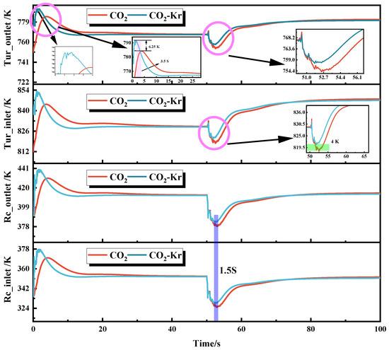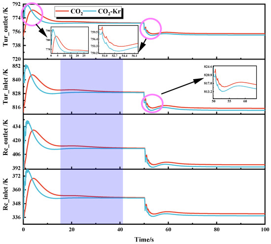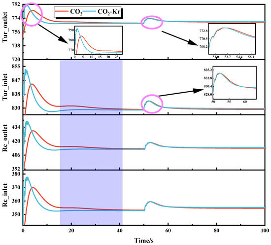 Figure 6 shows the temperature response distribution at key locations in the CO2 and CO2–Kr systems under mass flow disturbance. When the system reaches steady operation, a downward step disturbance in mass flow is applied. The figure shows that, after the disturbance is applied, the temperature at key locations first decreases and then increases. This is because, with constant rotational speed and heat source power, a decrease in mass flow increases the heat absorbed per unit of working fluid, which causes the temperature to rise. However, in the early stages of the disturbance, due to the thermal inertia effect caused by the working fluid properties and the lag effect of the heat source, the temperature change at key locations initially shows a downward trend. Around 53 s, the thermal inertia and lag effects gradually disappear, and the temperature rises. Therefore, the final stable temperature at the turbine inlet and outlet is higher than the pre-disturbance temperature. For the re-compressor, during the final stable phase, the effect of the mass flow decrease on the re-compressor temperature is higher than the effect of efficiency decrease on the temperature. As a result, the temperature during the stable phase of the re-compressor is slightly lower than in the initial phase.