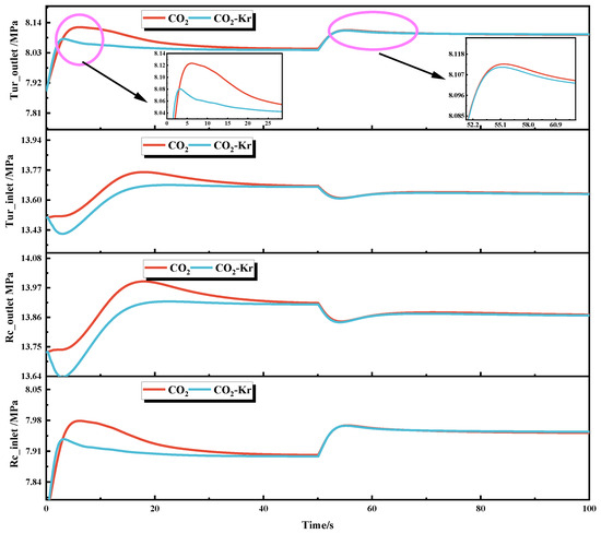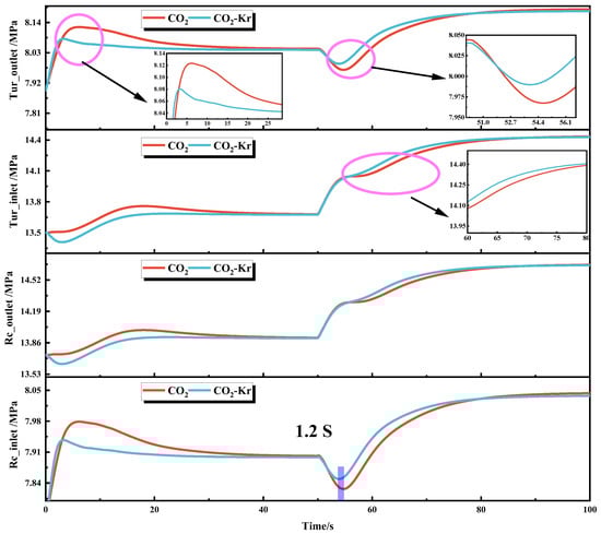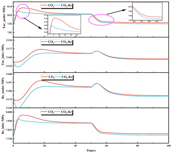 Similarly, the pressure response curves at the inlet and outlet of the re-compressor and turbine show dynamic changes, with significant differences between the CO2 and CO2–Kr working fluids, as shown in Figure 10. For the CO2, the re-compressor inlet pressure gradually rises from the initial value of 7.75 MPa to 7.90 MPa at 50 s. However, after the heat source decreases, the inlet pressure drops only slightly and then further decreases to 7.895 MPa at 50.7 s, accompanied by small fluctuations. The outlet pressure slowly increases from the initial 13.73 MPa to 13.91 MPa at 50 s, and after the disturbance, it gradually stabilizes at 13.81 MPa, with a small overall fluctuation. The turbine inlet pressure in the CO2 system gradually rises from 13.49 MPa to 13.68 MPa at 50 s and then continues to fluctuate, reaching 13.569 MPa at 100 s. The turbine outlet pressure rises from 7.89 MPa to 8.04 MPa at 50 s, then quickly drops to 8.00 MPa after the heat source decreases, finally stabilizing at 7.93 MPa at 100 s. This trend is primarily driven by the thermodynamic imbalance caused by the sudden drop in heat source power. The reduced thermal load leads to a decline in the heat absorption capacity of the working fluid. To maintain flow balance, the re-compressor needs to adjust its compression ratio, which causes fluctuations in the inlet pressure due to changes in the fluid density. The brief increase in turbine inlet pressure results from the system’s inertia, causing a delayed response and a gradual decrease due to the interruption of the heat source.