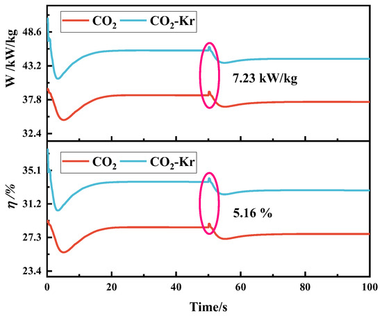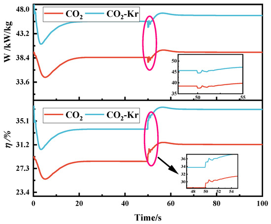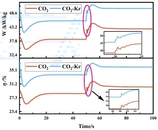 Similarly, the system performance exhibits corresponding response characteristics after the disturbance, as shown in Figure 14. The efficiency and specific work response curves of CO2 and CO2–Kr show significant differences. During the initial stable phase, the efficiency and specific work of CO2–Kr are significantly higher than those of CO2. As the speed decreases, both working fluids exhibit a decreasing trend in efficiency and specific work, but the rate of decrease and the final stable values differ. At 50 s, the efficiency of CO2 drops to 28.48%, a decrease of 0.74% from the initial value, while the efficiency of CO2–Kr drops to 33.76%, a decrease of 1.17%. Regarding specific work, CO2 drops from 39.51 kW/kg to 38.49 kW/kg, while CO2–Kr drops from 47.29 kW/kg to 45.64 kW/kg. Between 50 and 100 s, the efficiency and specific work of CO2 tend to stabilize. The efficiency and specific work of CO2–Kr also stabilize, but the drop is more significant, and the values remain consistently higher than those of CO2.