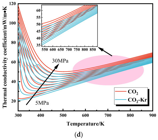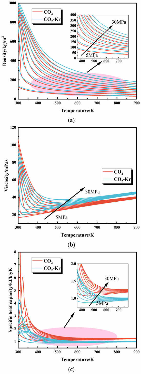 Figure 15 compares the density, viscosity, specific heat capacity, and thermal conductivity of two working fluids, CO2 and CO2–Kr, within the temperature range of 300 K–900 K and pressure range of 5 MPa–30 MPa. The figure shows that the CO2–Kr mixture exhibits significant differences from pure CO2 in terms of density, viscosity, specific heat capacity, and thermal conductivity. The density of the CO2–Kr mixture is higher than that of pure CO2. As the temperature increases, the density decreases more significantly, indicating that its volume expansion effect is more pronounced under high-temperature conditions. CO2–Kr generally has a higher viscosity than pure CO2, with the difference becoming more pronounced at higher temperatures and pressures. This results in lower friction losses in the CO2–Kr system, thus improving system efficiency. Regarding specific heat capacity, the CO2–Kr mixture has a lower specific heat capacity than pure CO2, especially at high temperatures and low pressures. This means that the CO2–Kr system has weaker heat absorption and release capabilities, allowing for a faster response to temperature changes but with a relatively weaker thermal buffering capacity. The CO2–Kr mixture also has a lower thermal conductivity than pure CO2, indicating weaker heat transfer capabilities, which may slow heat transfer during thermal regulation, thus affecting the system’s thermal efficiency and dynamic response characteristics.