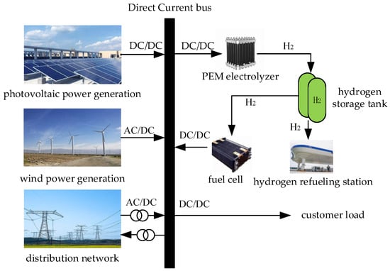 The electric–hydrogen-coupled distributed power generation system combines renewable new energy with electrolytic water hydrogen production technology, and addresses the mismatch between electricity supply and user load through grid connection, mainly including the wind-power generation system, photovoltaic power generation system, electrolytic water hydrogen production system, and fuel cell system. Among them, wind-power generation and photovoltaic power generation systems are influenced by the complementary characteristics of wind and solar energy resources in terms of time and season. The combination of the two ensures the continuity and stability of power supply [,]. The wind-power and photovoltaic-power generation systems are connected to the distribution network and jointly supply power to user loads and PEM electrolysis cells. The electrolytic water hydrogen production system consists of an electrolytic cell and a hydrogen storage tank. The system is combined with a fuel cell system and serves as a load during peak power generation periods and as a power source during low power generation periods, achieving peak shaving and valley filling of load energy demand and reducing the impact of random load fluctuations on the power grid. When the power generation system cannot meet the load demand, the output of fuel cells fills the gap in electricity, but still cannot partially supplement the electricity purchased from the grid; when the power generation system fully meets the load demand, the PEM electrolysis tank consumes excess electricity, and the generated hydrogen gas is compressed and stored in hydrogen storage tanks to provide fuel for fuel cells or for sale. The remaining electricity is sold to the power grid. In summary, the electric–hydrogen coupled distributed generation system not only achieves the maximization of wind and solar power consumption and economic benefits, but also plays a certain role in improving load demand fluctuations [], promoting the stability of system power supply (Figure 1).