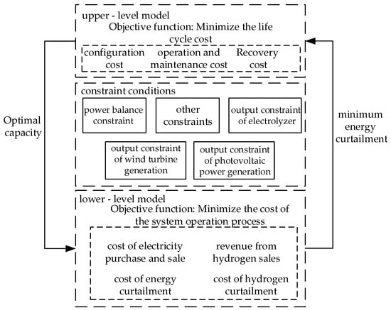 The capacity configuration optimization model of the electric–hydrogen coupled distributed power generation system constructed in this article is a two-layer model, which is solved through upper and lower layer coupling calculations. The upper layer solves the problem through intelligent algorithms and passes the obtained capacity configuration to the lower layer. The lower level model contains numerous constraints and variables, forming a composite nonlinear structure. Based on the constraints, the lower layer optimizes the scheduling using the YALMIP toolkit in MATLAB 2022b and Cplex 2022b solver. The calculated system operating costs are fed back to the upper layer for iterative optimization, ultimately obtaining the optimal capacity configuration for the electric–hydrogen coupled distributed generation system. The schematic diagram of the double-layer optimization model in this article is shown in Figure 3.