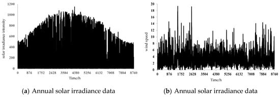 This paper takes the annual solar irradiance and wind—speed data of a certain region in northern China as an example. The sampling interval is 1 h, as shown in Figure 4. Considering the impact of the volatility of wind and solar power generation on the system, a comparative analysis of the comprehensive operation cost and economic benefits of the system is carried out. The model predicts the output of wind and solar power based on wind speed data and solar radiation intensity data, and realizes the hourly matching between power generation and load through optimal capacity configuration. To facilitate the calculation, the wind and solar power output data of a typical 24 h day are selected for wind and solar power output prediction. In the case study, the peak load of the region is 3 MW, which meets the daily electricity load demand of users.