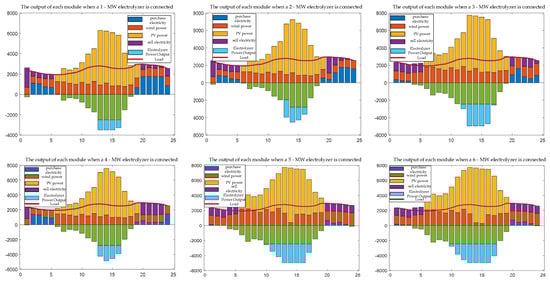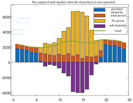Figure 5 shows the capacity configuration results without adding a hydrogen production module. During the daytime, from 10:00 to 17:00, wind- and solar-power generation fully meets the load, and excess electricity is sold to the grid. At night, if the wind- and solar-power generation is insufficient, electricity can be purchased from the grid to supplement the user’s electricity shortage. From 20:00 to 24:00, the user load is relatively high, but wind and photovoltaic power generation are low, and the peak purchased electricity reaches about 2000 kW. The photovoltaic output reached its peak from 13:00 to 16:00, and the peak electricity sales reached about 4000 kW, causing a great impact on the power grid.