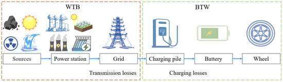 Based on the life cycle assessment (LCA) framework, this study focuses on the operational phase of vehicles and develops a model to quantify the annual carbon emissions of privately owned EVs. As illustrated in Figure 2, the EV emission lifecycle comprises two phases: Well-to-Battery (WTB) and Battery-to-Wheels (BTW). Since the adoption of EVs shifts operational-phase emissions to the electricity generation stage, the carbon footprint of EVs is inherently linked to the grid’s carbon intensity. Importantly, grid carbon intensity encompasses total greenhouse gas emissions from power generation to end-user delivery, including inherent energy losses during transmission and distribution. For example, if an EV consumes 1 kWh of electricity, the actual amount generated at power plants is higher due to efficiency losses in the system. It should be noted that this model excludes upstream emissions from raw material extraction due to data and methodological limitations.