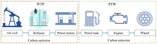 For ICEVs, carbon emissions during the operational phase are evaluated using the following LCA framework (Figure 3), which encompasses the Well-to-Pump (WTP) and Pump-to-Wheels (PTW) phases. ICEV carbon emissions arise from direct tailpipe emissions and indirect refinery processes. Analogously, upstream emissions (e.g., crude oil extraction) are excluded due to data limitations.