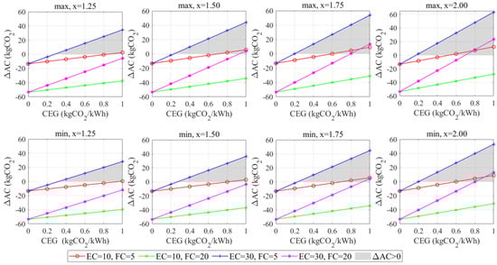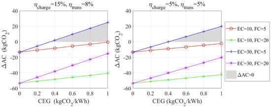 Here, regarding charging losses (ηcharge) and transmission losses (ηtrans), two extreme scenarios are analyzed: maximum losses (ηcharge = 15%, ηtrans = 8%) and minimum losses (ηcharge = 5%, ηtrans = 5%). It can be seen, when AMEV equals AMICEV, that the sign of ΔAC is determined by the specific values of ECEV, FCICEV, and CEG. To investigate how these parameters influence ΔAC, a simulation analysis was conducted, with results presented in Figure 4.