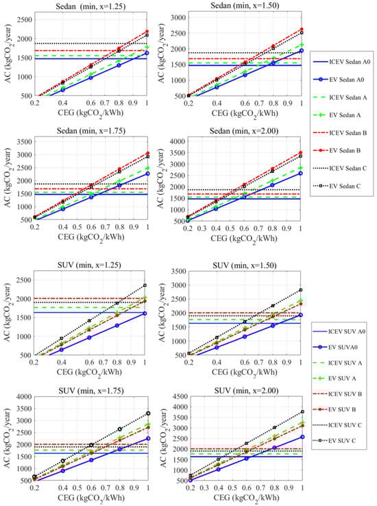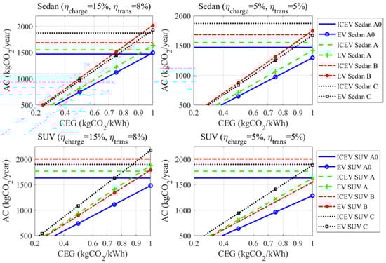 Energy consumption metrics (ECEV, FCICEV) significantly influence the EV-ICEV emission gap. For example, increasing ECEV from 10 to 30 kWh/100 km and FCICEV from 5 to 20 L/100 km widens the gap across all CEG levels. To quantify the combined effects of ECEV, FCICEV, and CEG on ΔAC and assess vehicle class impacts, we analyzed data from Zhang et al. [18] (Table 1), assuming an annual mileage of 10,000 km for both vehicle types. Results in Figure 5 show that under maximum loss conditions (ηcharge = 15%, ηcharge = 8%), EVs outperform ICEVs across all classes (Sedan/SUV) when CEG < 0.7 kgCO2/kWh. Under minimum loss conditions (ηcharge = 5%, ηtrans = 5%), EVs remain cleaner for all classes at CEG < 0.8 kgCO2/kWh, confirming their emission advantages in low-carbon grids. However, higher CEG triggers emission reversals in specific models: (1) B-class EV sedans exceed ICEVs at CEG = 0.9 kgCO2/kWh, and (2) C-class EVs (sedans/SUVs) exceed ICEVs at CEG = 1.0 kgCO2/kWh. Notably, A0-class EV SUVs retain advantages at high CEG, likely due to low ECEV and CEG insensitivity.