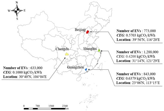 To analyze how regional energy profiles influence EVs’ emission reduction efficacy, we employ a spatially differentiated framework. Four megacities—Beijing (North China), Shanghai (East China), Guangzhou (South China), and Chengdu (Southwest China)—were selected (Figure 8) to represent diverse grid types. By 2023, each city had over 500,000 EVs, with Shanghai leading at 1.288 million. Grid CEG in 2023 varied significantly: Chengdu (0.1000 kgCO2/kWh, lowest) vs. Guangzhou (0.6379 kgCO2/kWh, highest). This disparity highlights substantial regional differences in EVs’ indirect emissions relative to ICEVs.