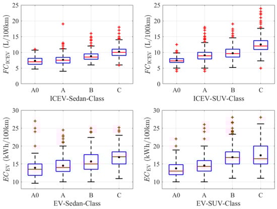 Additionally, the 100-km energy consumption gap between EVs and ICEVs is a critical determinant of their emission disparities. To capture real-world patterns, we employed web scraping to collect owner-reported 100-km energy consumption data from major platforms (e.g., Dongchedi, www.dongchedi.com (accessed on 11 April 2025); Autohome, www.autohome.com.cn (accessed on 11 April 2025)), yielding 19,057 valid records across four vehicle classes (A0, A, B, C) and two body types (sedans, SUVs): 12,268 ICEV records (6192 sedans and 6076 SUVs) and 6789 EV records (3189 sedans and 3600 SUVs). To account for regional variations in traffic, infrastructure, and driving behaviors, we analyzed energy consumption in conjunction with city-specific grid emission factors. Taking Beijing as an example, Figure 9 presents separate boxplots for EV and ICEV energy consumption, highlighting the median (red lines), mean (black dots), and outliers (+). After removing outliers, we calculated descriptive statistics (median, quartiles, max, min, mean) to characterize energy consumption patterns. Subsequently, by integrating these with grid CEG and annual mileage, we quantify annual carbon emission disparities between EV and ICEV owners.