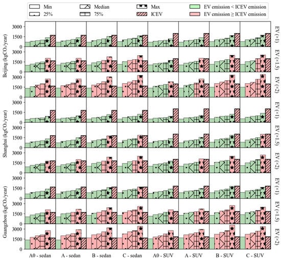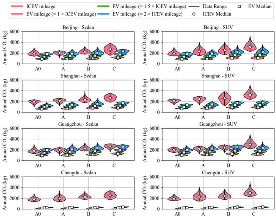 The annual CO2 emissions for ICEVs and EVs were calculated using Equations (1) and (2), respectively. During the calculation, the efficiency factors ηcharge (charging losses) and ηtrans (transmission losses) were determined based on statistical data from the National Energy Administration: ηtrans was set to 6.5%, and ηcharge was set to 10% [54]. The average annual mileage for ICEV owners was set to 10,000 km, a value synthesized from statistical datasets and real-world vehicle usage scenarios [19,33]. Using a combined visualization approach of violin plots and boxplots, this study displays the distribution and heterogeneity of carbon emissions from EVs and ICEVs across four regional grid carbon intensities (Beijing, Shanghai, Guangzhou, Chengdu); four vehicle categories (A0 to C-class sedans/SUVs); and mileage multipliers relative to the ICEV baseline (x = 1, 1.5, 2). The results are presented in Figure 10.