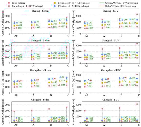 The above analysis reveals heterogeneity in carbon emission distributions of EVs and ICEVs across different cities, vehicle classes, and mileage multiplier (x) scenarios. However, real-world distributions are influenced by the interplay of user behaviors and regional grid characteristics. This necessitating the use of standardized models to identify universal patterns among core variables. Therefore, based on the average energy consumption data by vehicle class and Equation (3), the study constructs a lollipop chart (Figure 11) to quantify direct effects of grid carbon intensity (CEG) and mileage multiplier (x) on carbon emission differences (ΔAC) between equivalent EV and ICEV classes. This approach minimizes the impact of outliers and isolates the CEG-x interactions, providing robust theoretical boundaries for policy design.