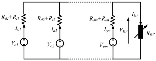 is the output voltage, is the output current, is the droop resistance and is the line resistance of the converter, and . is the total load current supplied by the parallel sources to the common EV load. and are the voltage and current of the DC bus feeding the EV load. is the total EV load resistance. The output voltage of converter is defined as follows: