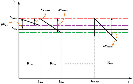 A droop curve is partitioned into several segments to configure the part of the curve in that segment such that the control parameters are flexible and varied to achieve better energy management with voltage regulation and proper source utilization simultaneously without any trade-off. The control parameters are the droop coefficient and the reference voltage in that particular segment. These are varied so that parallel sources are utilized properly to maintain a stable DC MG for highly intermittent EV charging load. A piece-wise droop curve is plotted in Figure 3, with (n − 1) boundary current values to divide the curve into n segments.