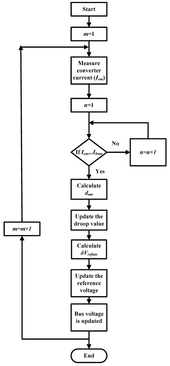 Flowchart of piece-wise droop controller with n regions for m parallel sources for optimized energy management of DC MG.