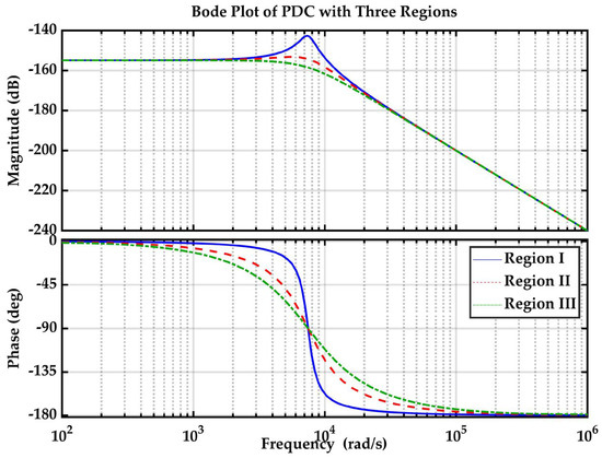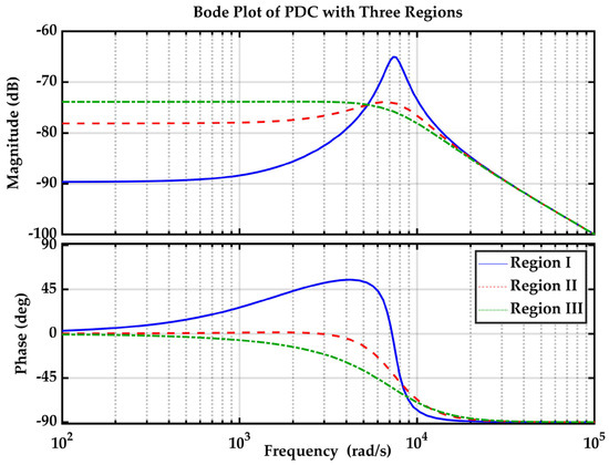 The Bode plot for Equation (50) is shown in Figure 5 and Equation (51) in Figure 6 for all three regions of the PDC strategy.