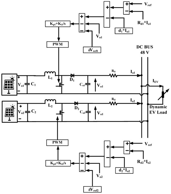 Figure 7 consists of two solar PVs in parallel connected to the DC bus through boost converters to supply a common EV load at 48 V. The converter gate pulses are generated with the proposed piece-wise droop controller with three regions [26]. The Simulink figure of the proposed DC MG with two parallel converters is shown in Figure A1 in Appendix A.