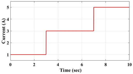 The effectiveness of the proposed controller is inspected with dynamically changing step-wise EV load and the same is compared with LDC and NLDC. The droop value () for the control loop of two sources is generated by the proposed PDC strategy and fed to piece-wise droop control loop. The error signal generated will be passed through a PI controller with proportional gain constants (, ) and integral gain constants (, ). The output of the PI controller is further passed to a PWM generator to generate pulses for their respective converters to obtain the desired output performance. The system parameters and the control parameters are listed in Appendix A, Table A1. The line resistances of the DC microgrid are taken in different ratios such as 1:2, 1:5, and 1:10 to demonstrate the effect of line resistance and the efficacy of the proposed controller in mitigating its effect on microgrid performance. To showcase the practicality for larger microgrids, the DC MG is integrated with four DERs with a line resistance ratio of 1:5:10:15 to improve the scalability and its performance is studied. The various ratios of the cable resistances are accounted for in the remote, small off-grid DC microgrid, in which sources can be far away from the charging station. From t = 0–3 s, the total demand for EV load is around 1 A, that is, 20% of the total load of the charging station of EV. From t = 3–7 s, the load demand is 3 A, which is 60% of the load demand, and from t = 7–10 s, the load demand is 5 A, which is the full load representing the dynamic EV load, with fluctuations over a small period indicating its intermittent nature, as shown in Figure 8. The bus voltage regulation and current sharing are the two parameters estimated to check the proper utilization of the parallel sources to supply the common load. The maximum allowable voltage variation () is 5% of the DC bus voltage (). The utilization factors of source-1 (), source-2 (), and voltage deviation () are calculated for all the cases and are listed in Table 2. The utilization factor and the voltage difference for the converter is defined by Equations (52) and (53), respectively.