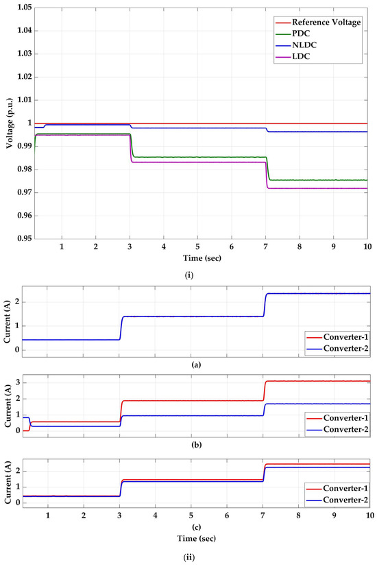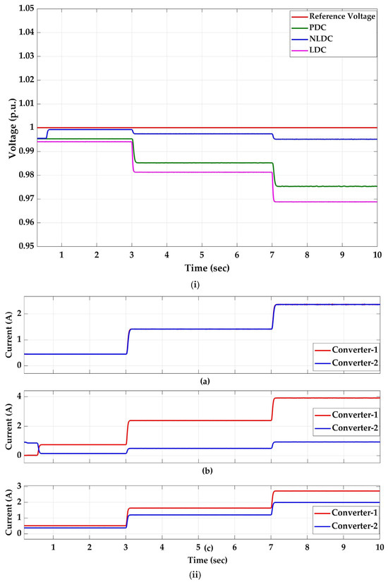 Figure 11 indicates the performance of the DC microgrid with a line resistance ratio of 1:10, that is, and . At t = 2 s, which is of the proposed PDC, the minimum obtained is 0.0009 A (Figure 9ii(a)), and the maximum obtained is 0.8179 A (Figure 9ii(b)); with the NLDC, though, it gives the best voltage of 0.9991 p.u (Figure 11i). At t = 5 s, when the load is 60%, the load currents fall into of the proposed controller and the obtained is 0.9790 p.u. (Figure 11i), with the updating of reference voltage by voltage compensator , and is 0.0040 A (Figure 11ii(a)) with PDC, obtained by updating the droop value as . At t = 8 s, i.e., in of the proposed controller, the obtained is 0.009 A, which is the lowest of all the other controllers, whereas the highest difference obtained is 3.6988 A with NLDC. with PDC is 0.9752 p.u., which is less than 5% of the maximum bus voltage. and with LDC are 0.0354 p.u. (Figure 11i) and 1.3880 A (Figure 11ii(c)), respectively, which shows the effect of increased line resistance difference when compared to cases i and ii. The effect of line resistance with NLDC is also evident from Figure 11ii(b), where is 2.4668 A for a 60% load change, whereas for case-i it is only 0.3300 A.