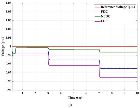 , with the proposed controller, after updating the droop value to 3.375 Ω and the reference voltage, is 0.9756 p.u. at t = 8; with the LDC it is 0.9966 p.u. and with the NLDC it is 0.9712 p.u. Although the NLDC exhibits better voltage regulation than the other controllers, , which is very high when compared to the values of the PDC and LDC, which are 0.0010 A and 0.2100 A, respectively.