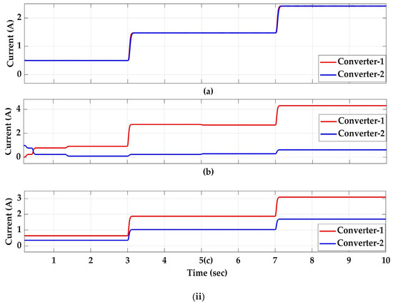 The droop resistance () for LDC is considered 0.5 Ω. The p.u. bus voltage () obtained at 20% EV load is 0.9941 p.u. at t = 2 s, which is within the tolerable limit (Figure 9i). and are 0.5186 A and 0.4752 A, respectively, indicating a mismatch in sharing the common load, as shown in Figure 9ii(c). However, with the NLDC with , the p.u. is 0.9993 p.u., which is almost the rated p.u. bus voltage (Figure 9i), but the current sharing is highly improper, with and being 0.6670 A and 0.3334 A, respectively, as shown in Figure 9ii(b). The 20% load with load current () falls into of the piece-wise droop curve with the boundary current value () of 2 A. with the proposed controller is 0.9948 p.u., as shown in Figure 9i, which is in the tolerable range, and the currents and are 0.4342 A and 0.4343 A, respectively, indicating almost proper current sharing between the parallel sources (Figure 9ii(a)).