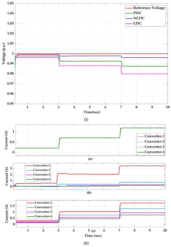 The DC MG is integrated with four ideal DERs with cable resistances of for DER 1, 2, 3, and 4, respectively. These resistances are in the ratio of 1:5:10:15. The system is studied with the proposed PDC and compared with LDC and NLDC strategies to show the effectiveness of the proposed strategy in eliminating the effect of line resistance when compared to LDC and NLDC. Figure 12i shows the voltage of the DC bus, and Figure 12ii shows the current sharing of all four DERs sharing a common load. The maximum voltage deviation () obtained by PDC, NLDC, and LDC is 1.25%, 0.39%, and 0.20% of the reference voltage, respectively. Although NLDC outperformed PDC in maintaining better voltage regulation, it utterly failed in current sharing among parallel DERs, which is evident from Figure 12ii. Equal current sharing is achieved with the proposed PDC, whereas the current sharing is worse with NLDC due to the trade-off limitation. This high-scale system analysis showcases the practicality of the proposed PDC technique and its application for larger MGs.