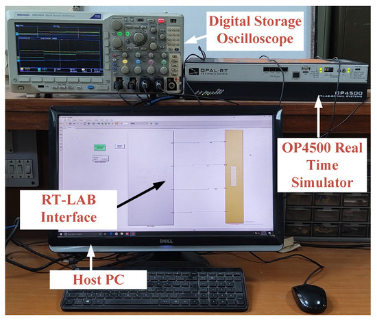 The real-time validation of the proposed DC MG for EV charging application controlled with PDC was executed in the RT-lab environment on the OP4500 real-time simulator, as shown in Figure 13. It consists of a XEON E3 processor and a Xilinx Kintex-7 FPGA co-processor. A sampling time of 20 µs is employed. The computation of droop and voltage compensation is distributed among four cores executing in parallel.