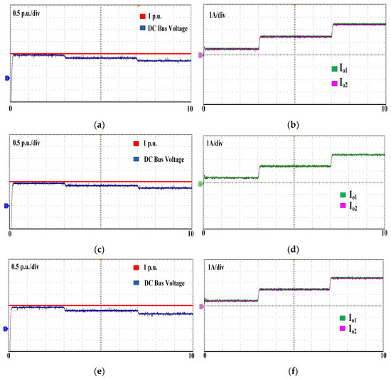 RT Lab results with the proposed controller: (a) p.u. bus voltage for ; (b) current sharing for ; (c) p.u. bus voltage for ; (d) current sharing for ; (e) p.u. bus voltage for ; (f) current sharing for . —output current of DER1 controlled with PDC. —output current of DER2 controlled with PDC.